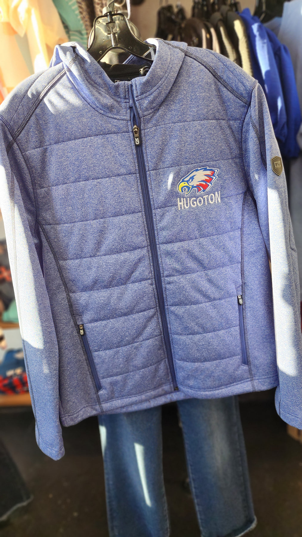 The full-zip design makes layering easy, while the bold embroidered left-chest “Hugoton” logo with an eagle head proudly represents team spirit and tradition. Whether you’re cheering from the stands or wearing it around town, this jacket delivers a polished athletic look with premium craftsmanship.